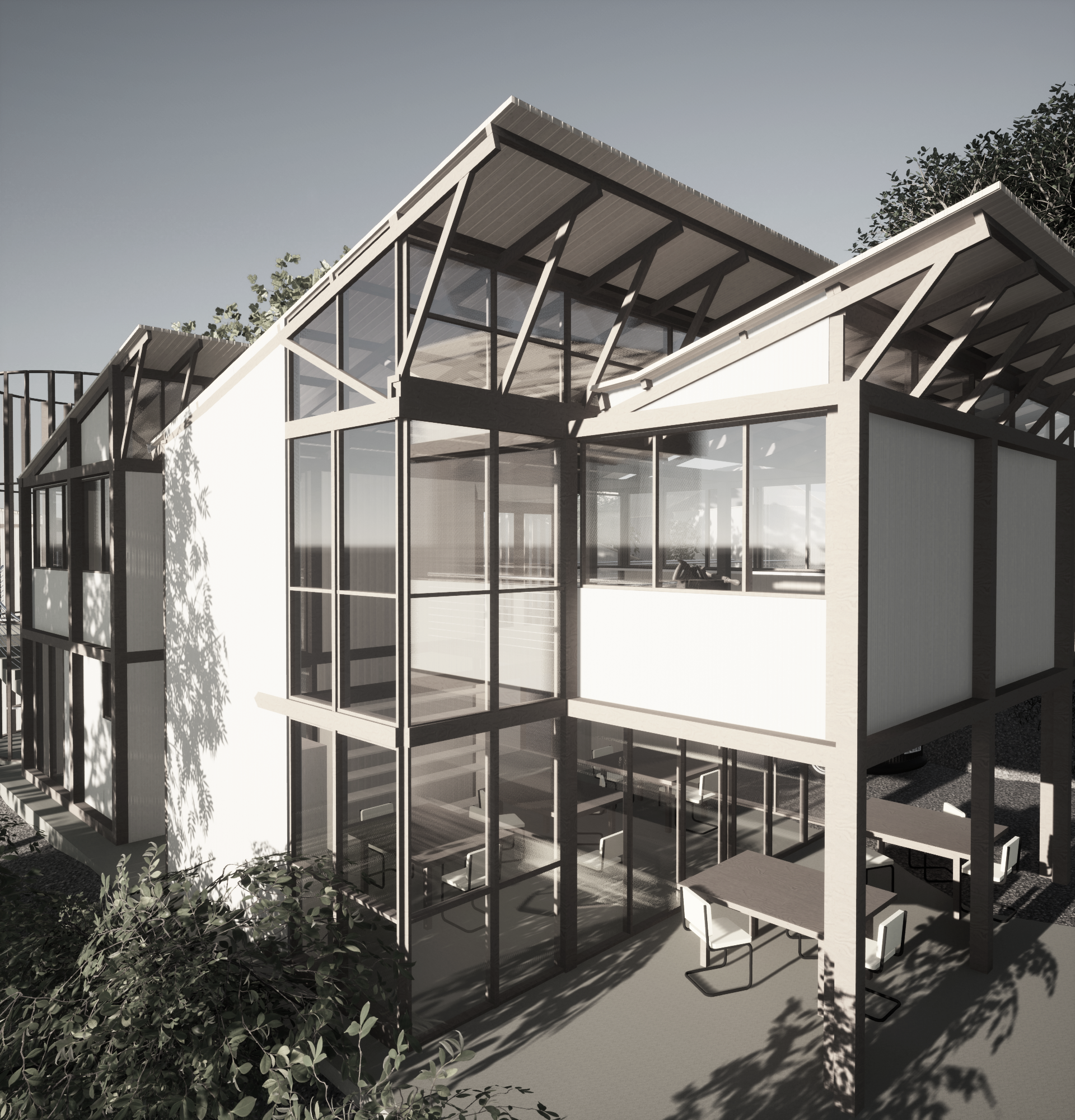 The building itself is assembled using the same materials that it distributes and manufactures within the space. Therefore, the design and material expression is defined by how S.I.P.s are assembled and connected, mainly as a modular principle. The layout of the space is to enhance openness to the public, letting natural light in, while also being fitted to its practical usage as a workshop space. There is visibility across the different spaces of the building which creates a sense of publicness and sociability