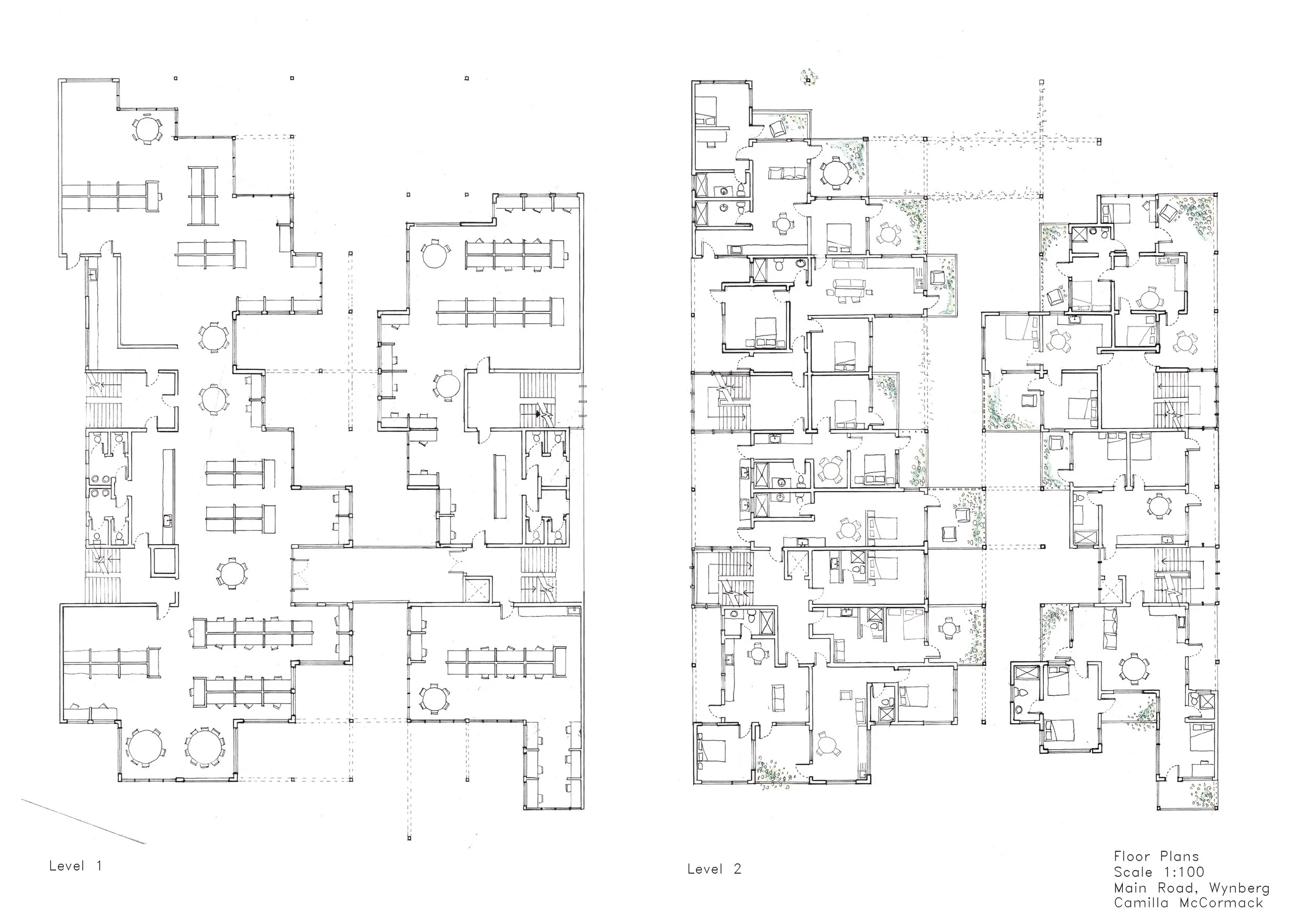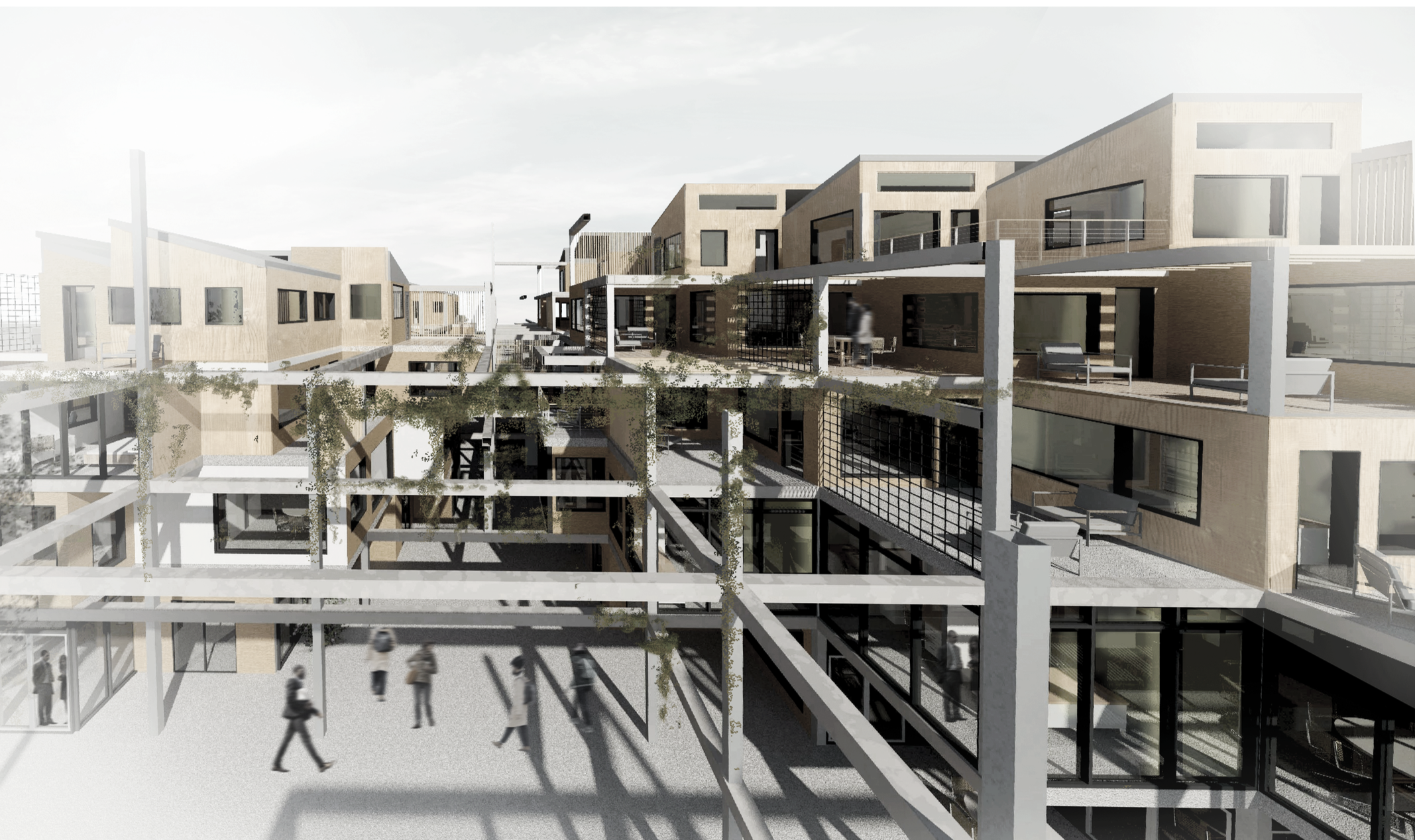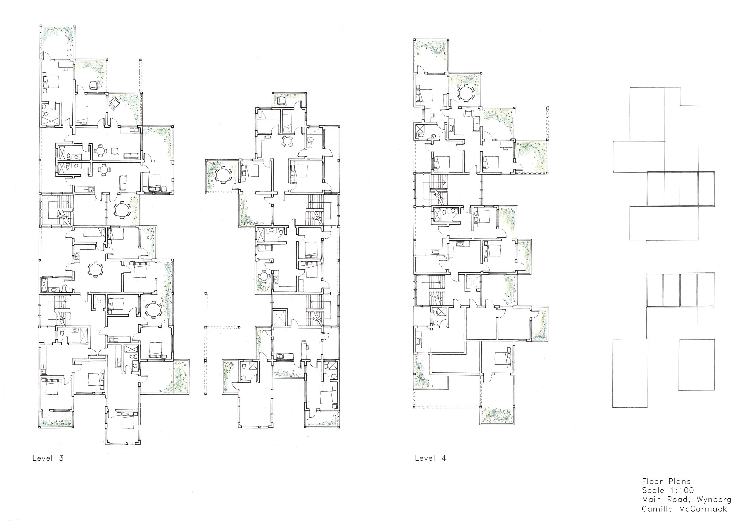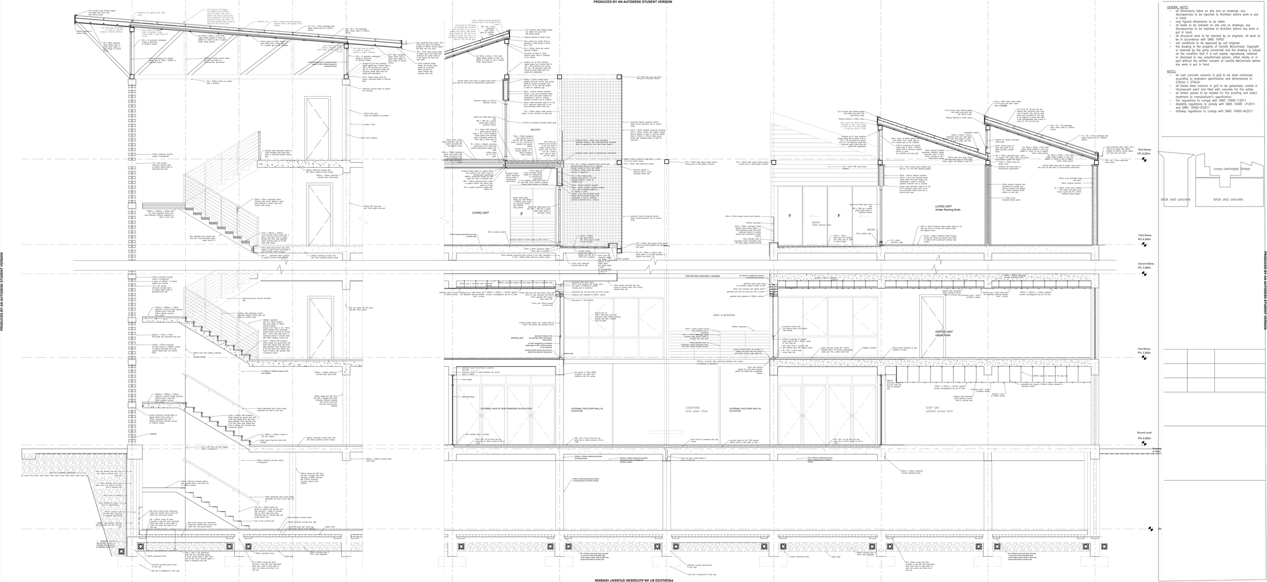 This project investigates the accomodation of affordable housing with mixed-use developments in Cape Town, where both formal and informal trade sectors are accounted for. The proposal explores the material potential of modular design and cross-laminated timber technology to provide a sustainable approach to inner-city building developments in the South African context. The design was developed through model building and sketching. The outcome of this process is a modular terraced structure to create a form that would maximise light in all units of the building. The building is also split in two parts to create a walk through-market space as well as to optimise light gains towards the centre of the building. The grid-like layout informs the circulation and structural elements of the building.