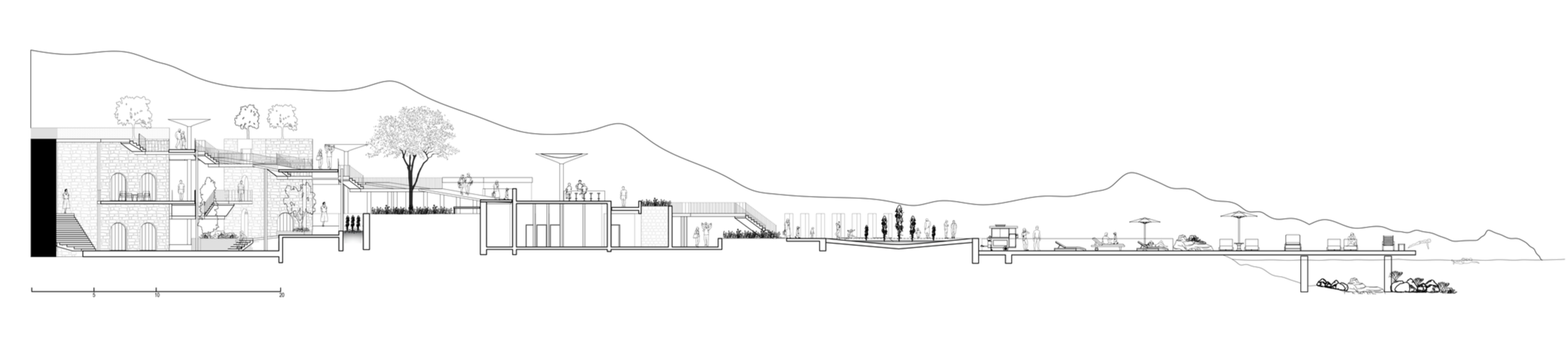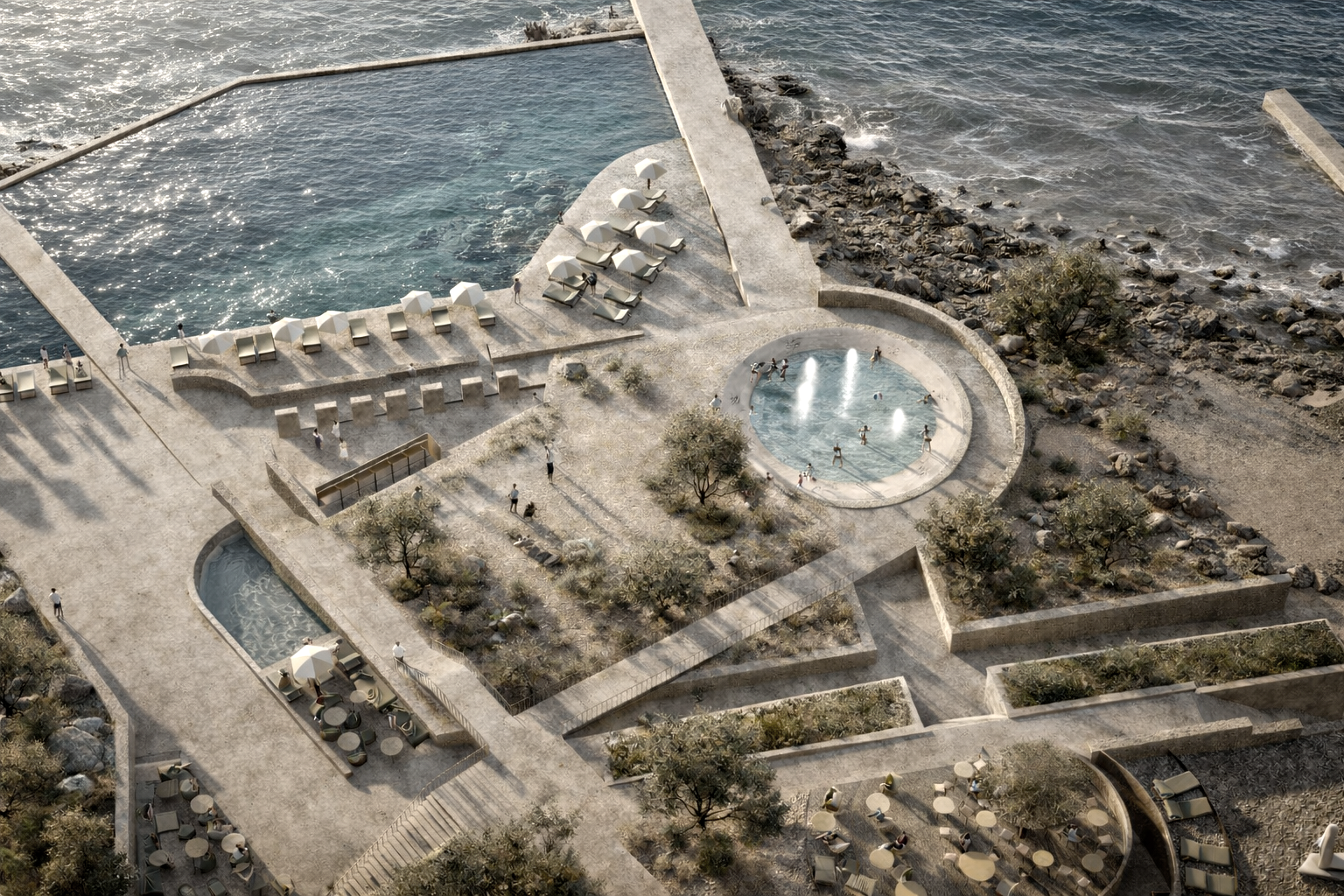 The proposal articulates a network of pathways, terraces, and shaded enclaves, where hard and soft surfaces converge to shape a nuanced topography of movement and repose. These interconnected sequences accommodate a spectrum of temporalities—from brief encounters with the water to longer leisure and communal gathering—reflecting the rhythms and rituals of Mediterranean seaside life.