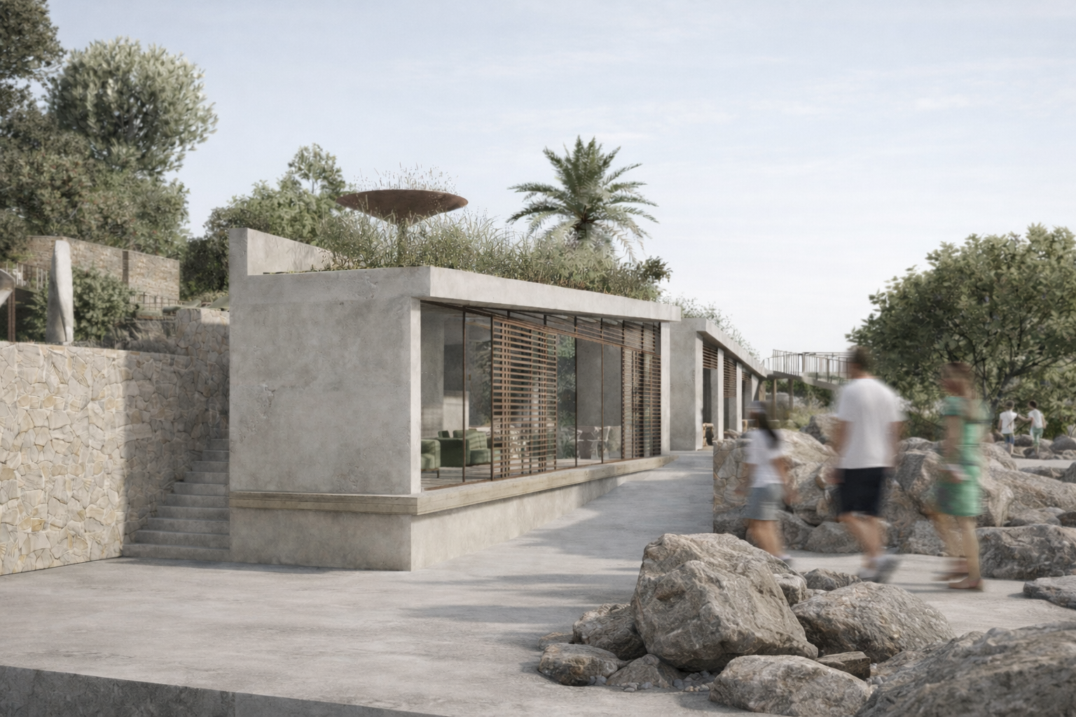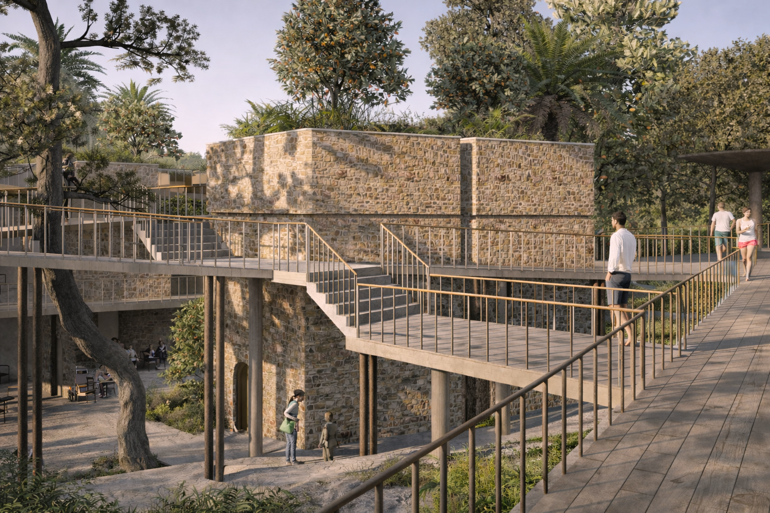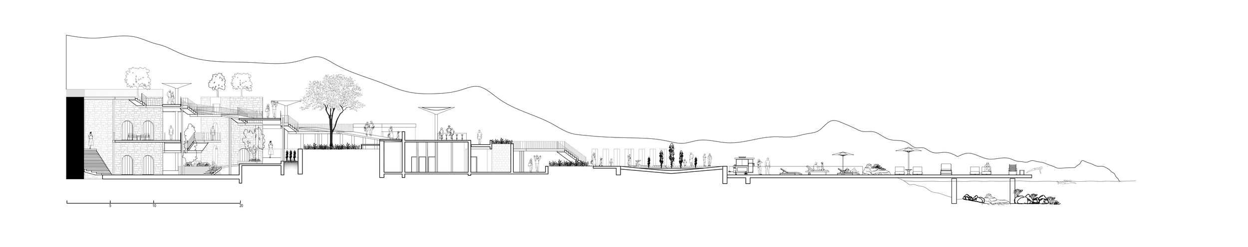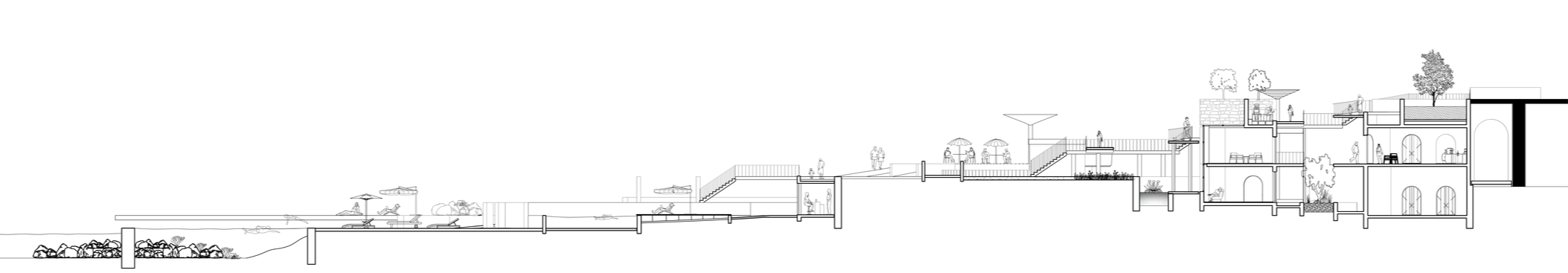 The proposal articulates a network of pathways, terraces, and shaded enclaves, where hard and soft surfaces converge to shape a nuanced topography of movement and repose. These interconnected sequences accommodate a spectrum of temporalities—from brief encounters with the water to longer leisure and communal gathering—reflecting the rhythms and rituals of Mediterranean seaside life. Circulation, sightlines, and sequencing define the spatial composition, alternating between direct, linear paths and winding, elongated routes. Buildings and structures are strategically positioned between pathways, emerging from and reinforcing the flow. Architecture and movement mutually generate one another creating a dynamic interplay between circulation, program, and spatial experience.