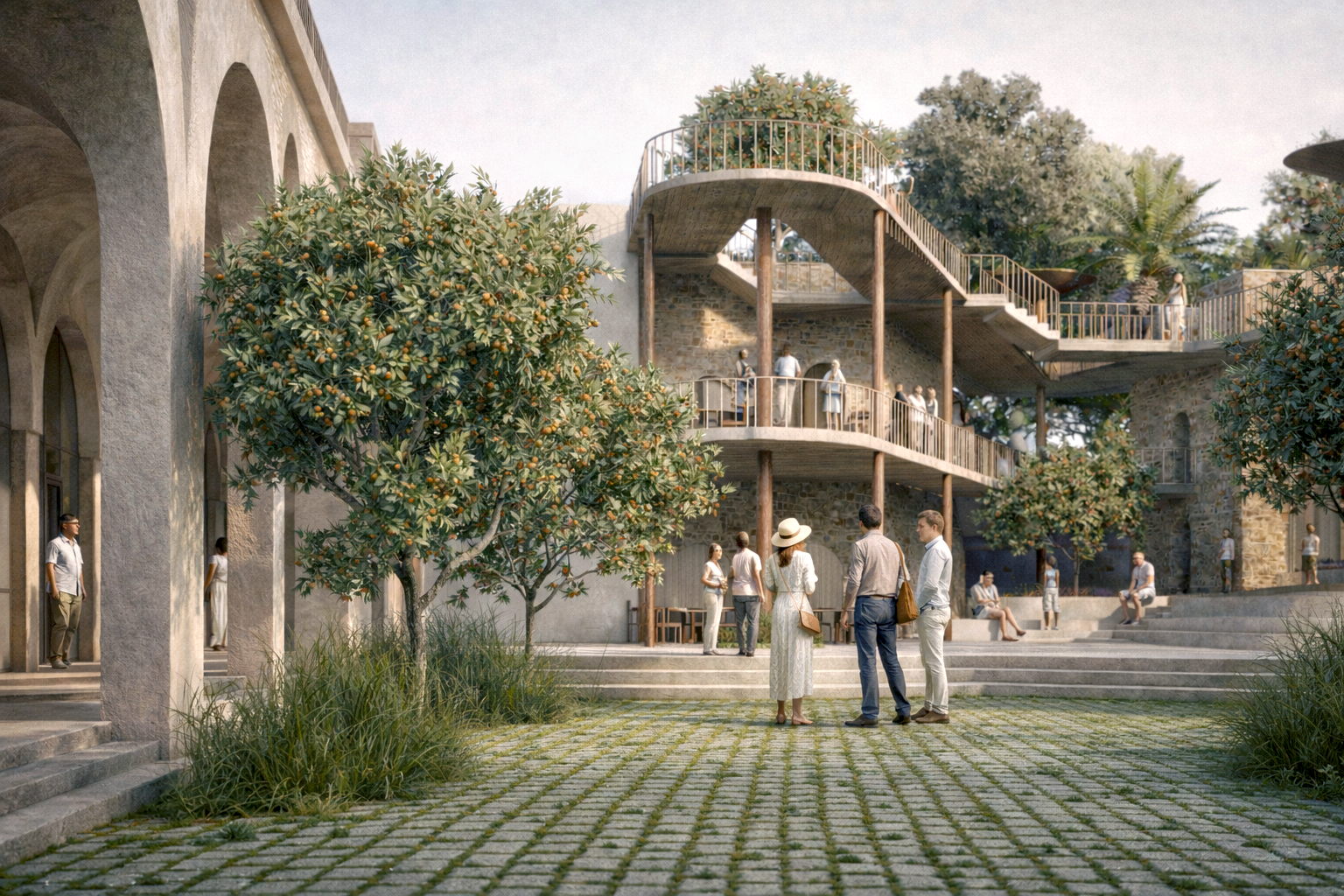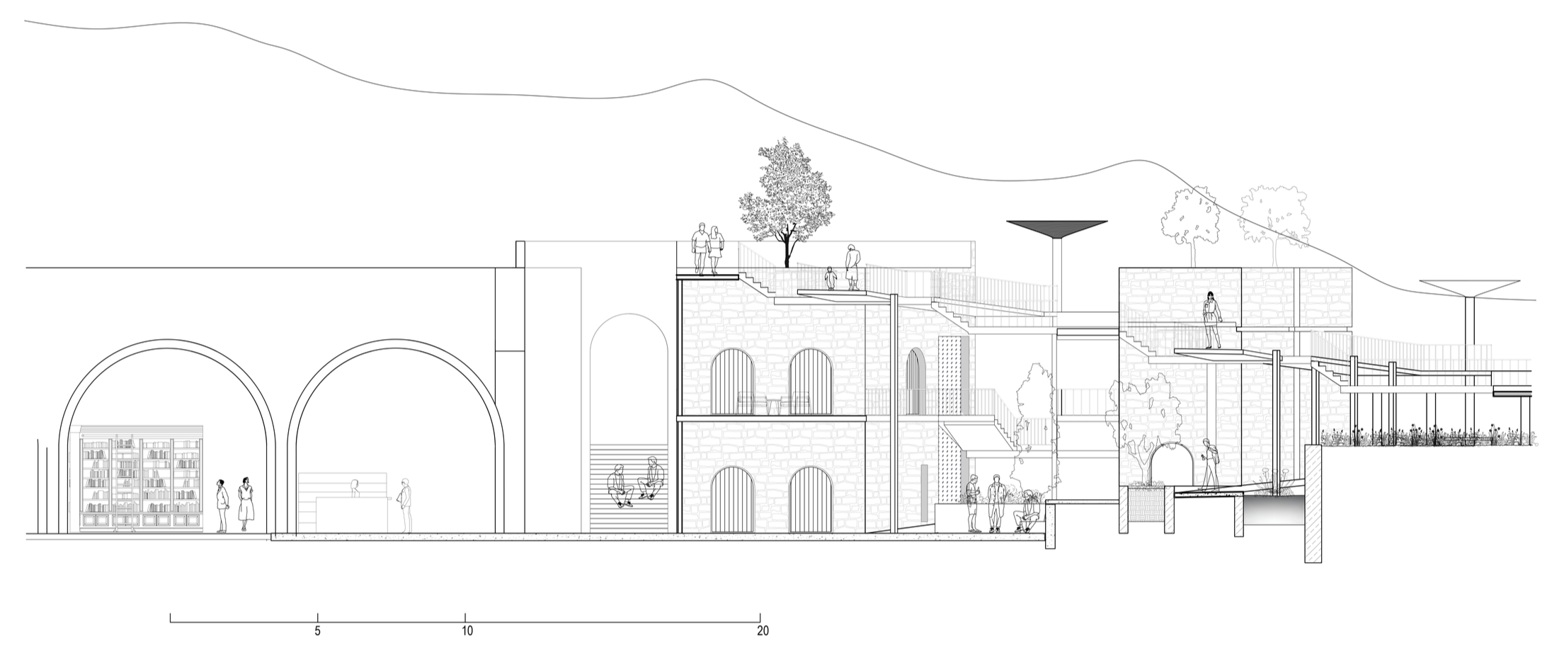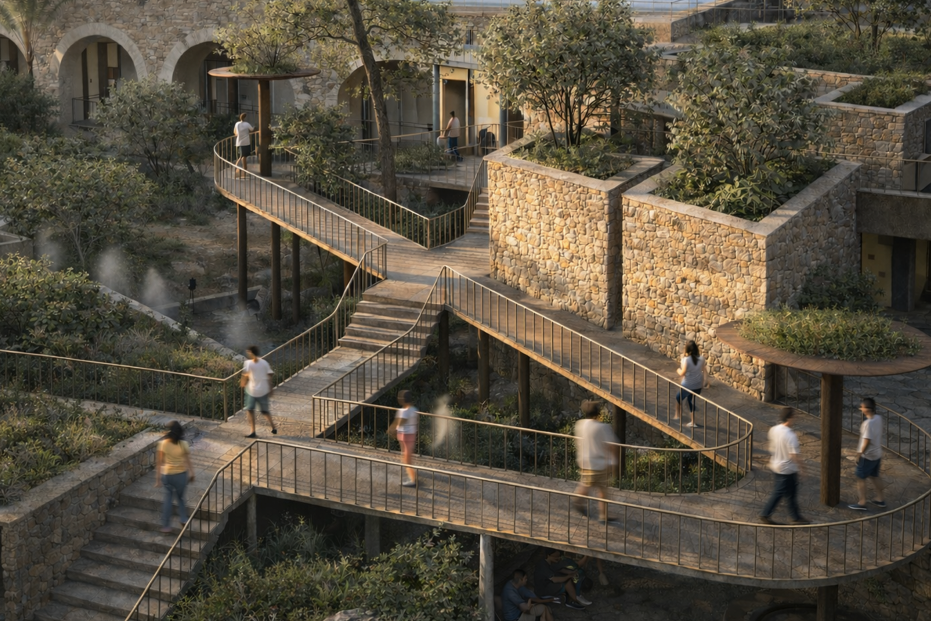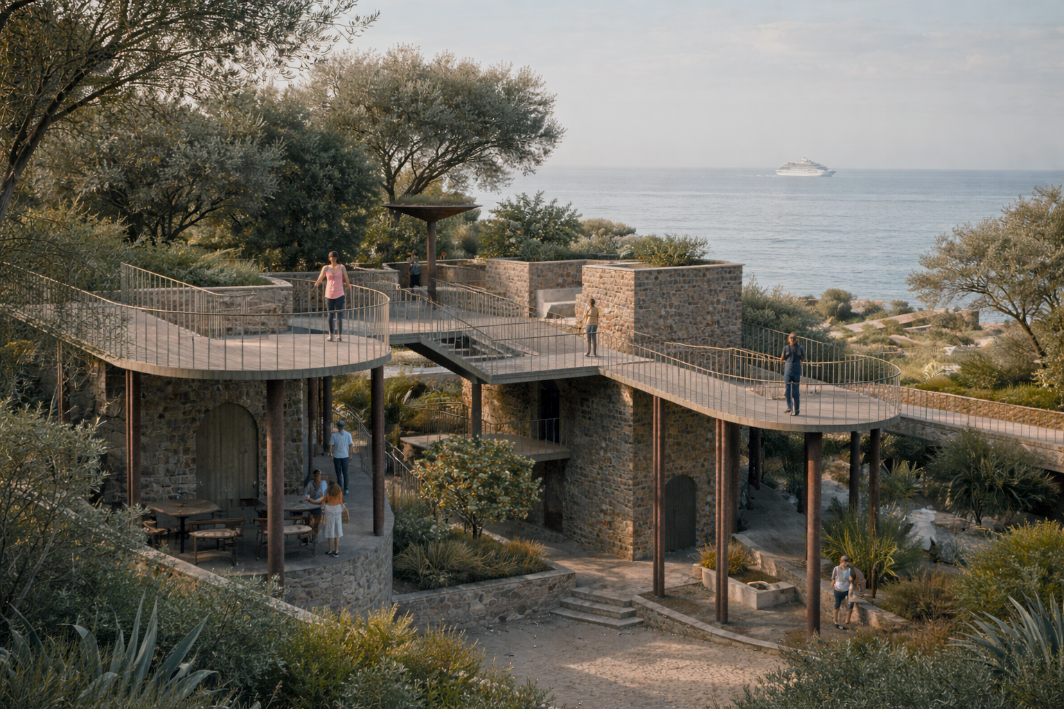 The proposal articulates a network of pathways, terraces, and shaded enclaves, where hard and soft surfaces converge to shape a nuanced topography of movement and repose. These interconnected sequences accommodate a spectrum of temporalities—from brief encounters with the water to longer leisure and communal gathering—reflecting the rhythms and rituals of Mediterranean seaside life. Circulation, sightlines, and sequencing define the spatial composition, alternating between direct, linear paths and winding, elongated routes. Buildings and structures are strategically positioned between pathways, emerging from and reinforcing the flow. Architecture and movement mutually generate one another creating a dynamic interplay between circulation, program, and spatial experience.