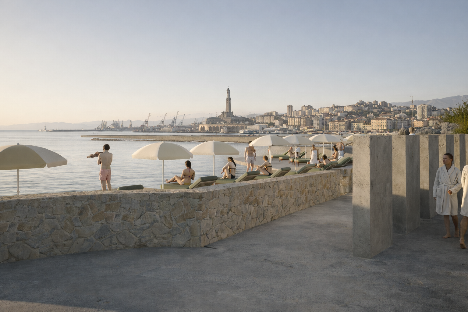 This project investigates the coastline as a site of public access, urban commons, and cultural infrastructure, exploring how the fragmented beach territories along the Linea Mare can be reconfigured to support diverse social, recreational, and cultural uses. Treating the seafront as a dynamic urban-recreational landscape, the intervention transforms a neglected stretch beneath Corso Italia into a layered public realm of pathways, terraces, shaded retreats, and programmed zones—fostering experiences that range from brief encounters with the sea to extended communal engagement. By integrating ecological systems, recreational infrastructure, and cultural programming, the project demonstrates how shrinking port cities can activate interstitial coastal zones, balancing accessibility, identity, and environmental responsiveness. Through the interplay of hard and soft landscapes, social choreography, and microclimatic strategies, the design establishes a resilient recreational ecology where architecture mediates between natural processes, public life, and urban infrastructure to create a culturally resonant seafront.