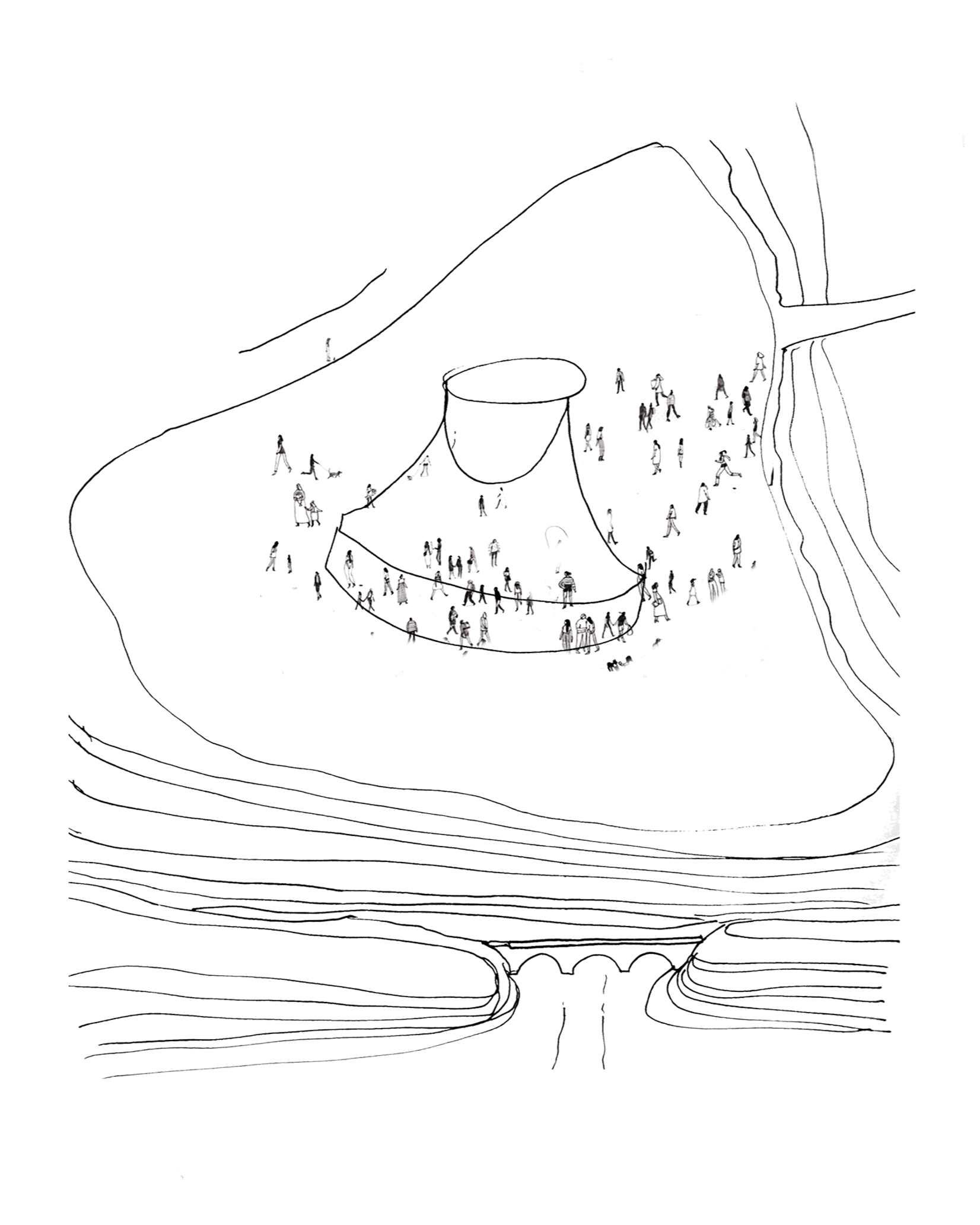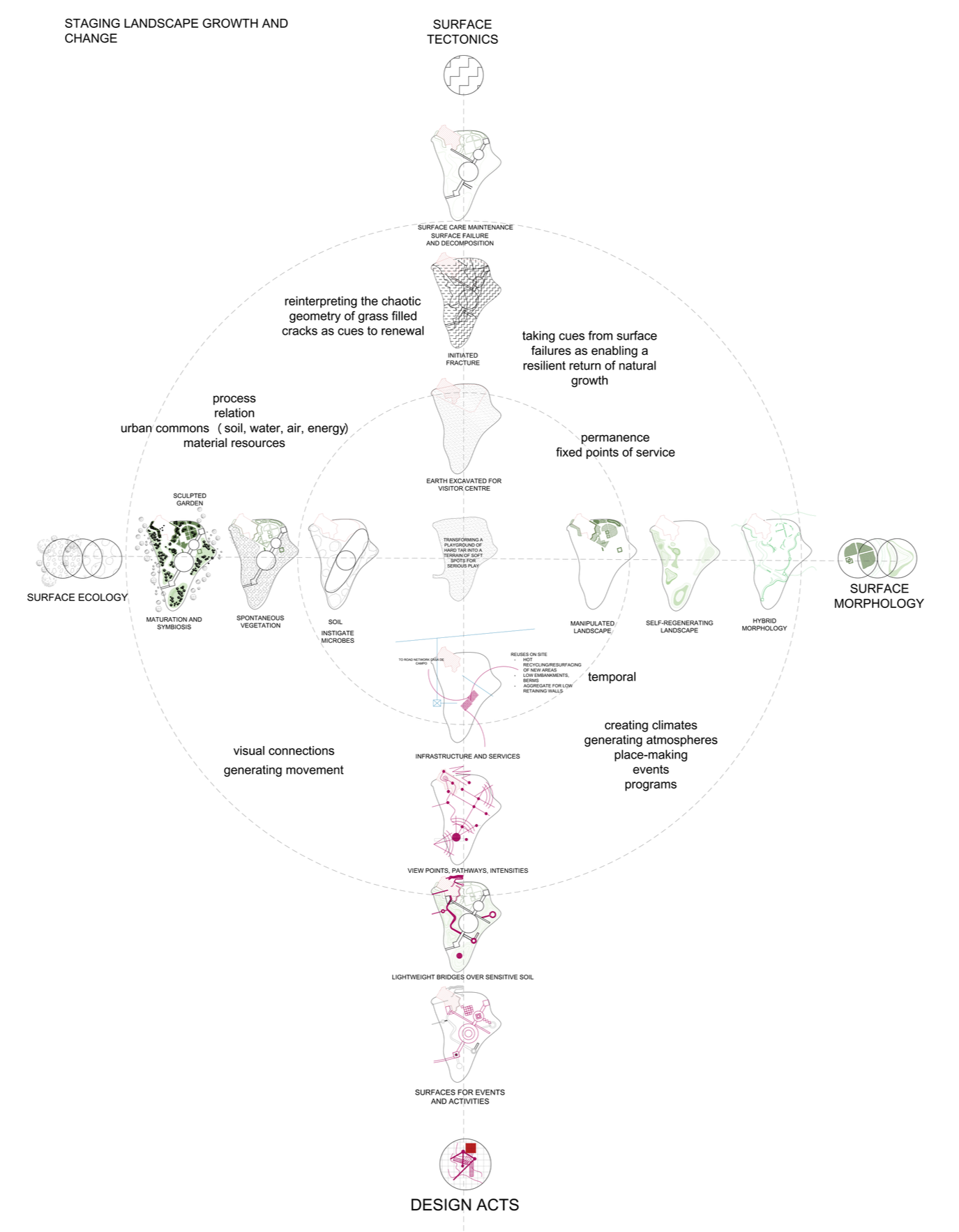 Diagrams and sketches were used to imagine Puerta de Ángel as a site in constant evolution—shaped by seasonal events, everyday use, and human interaction. Cracks, informal paths, vegetation, and subtle topography become tools to choreograph movement and guide experience. The site is treated as a living system, where activity and interventions interact over time, creating a hybrid landscape between city and park.Explorations are structured through four themes: design acts (how movement is guided), surface ecology (how materials and vegetation support dynamic use), surface morphology (topography and subtle shifts in elevation), and surface tectonics (material layering and construction mediating human scale). Together, these studies informed the detailed, adaptive design of Puerta de Ángel.
