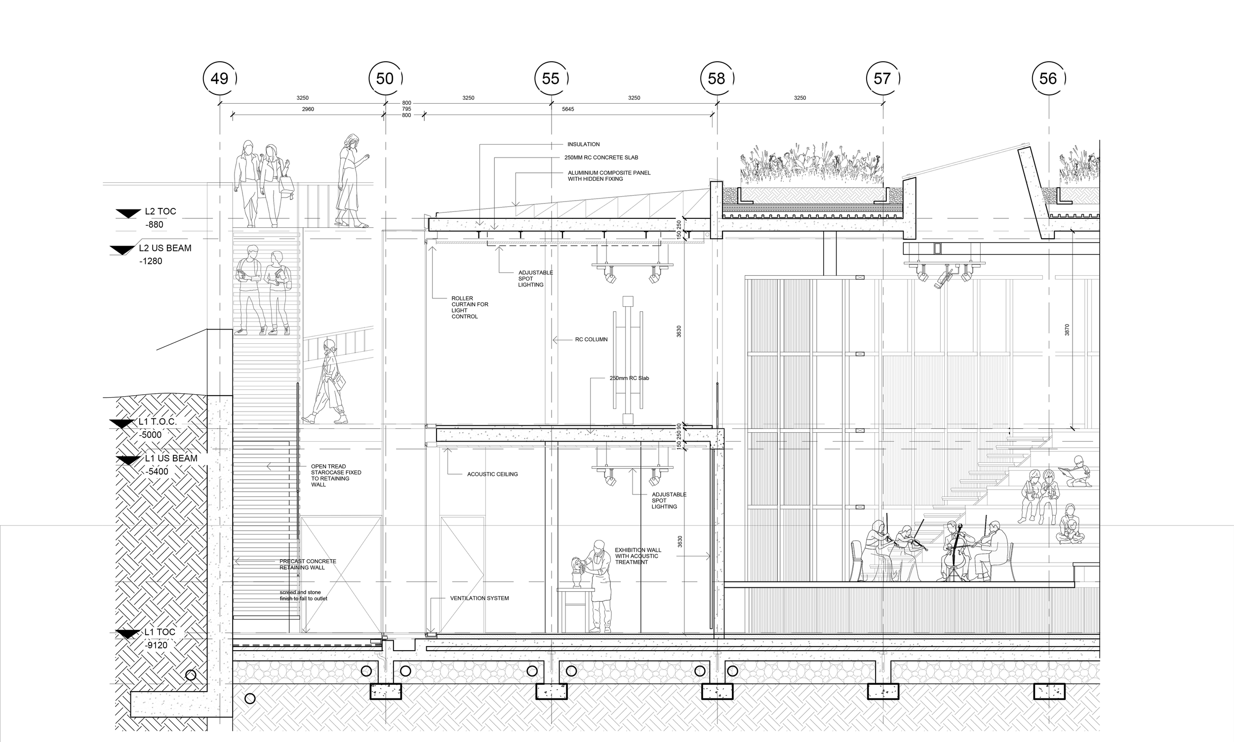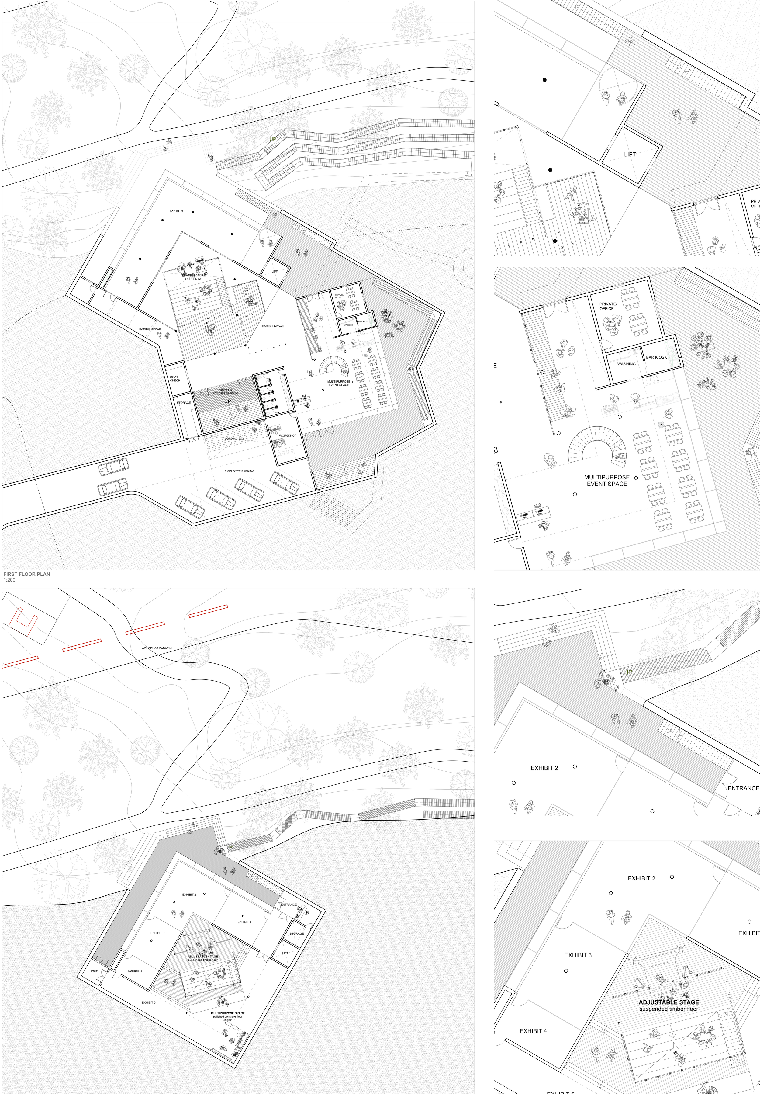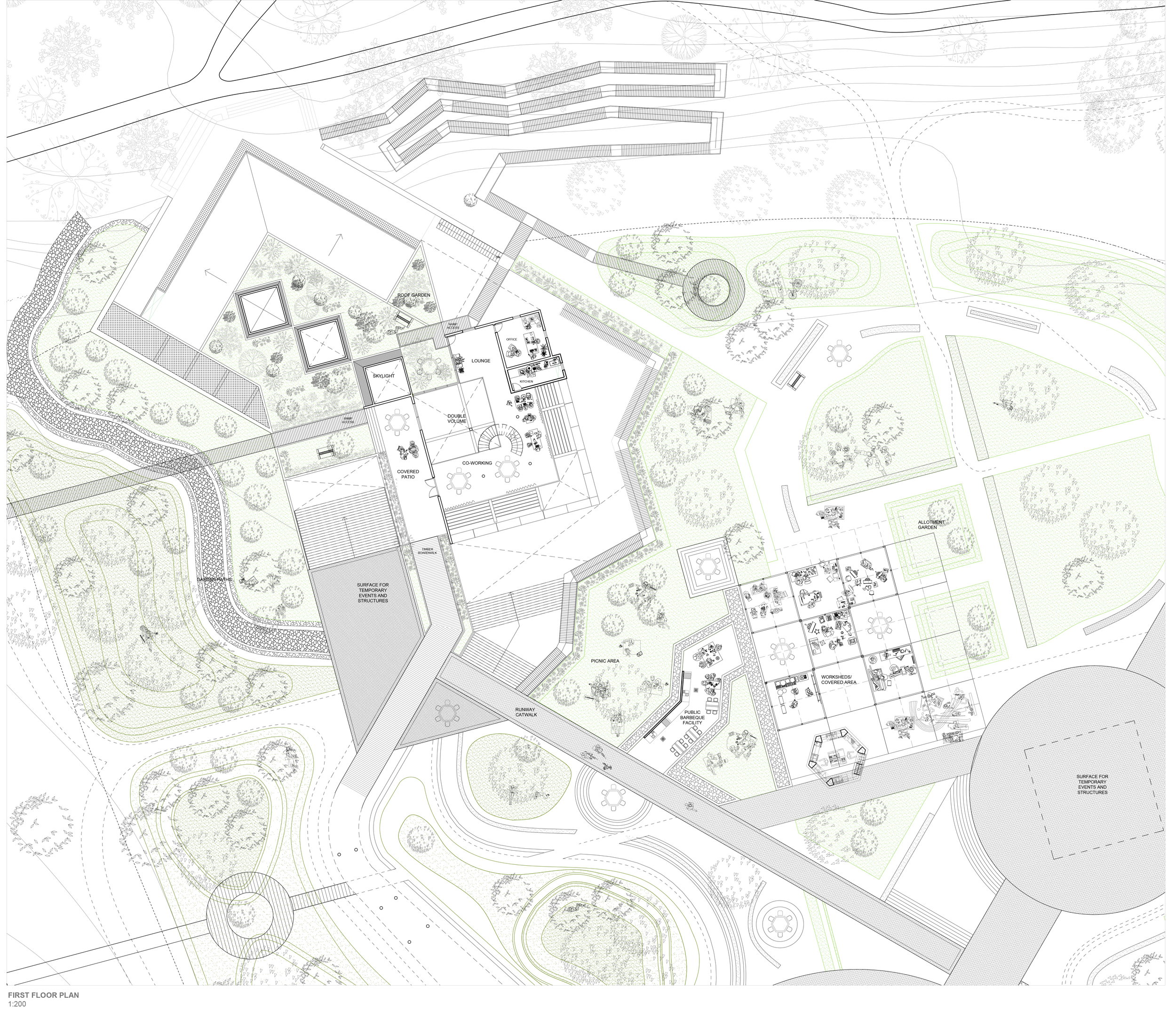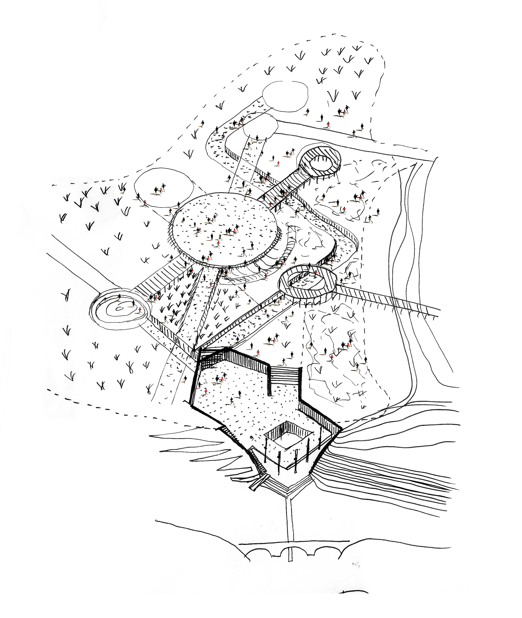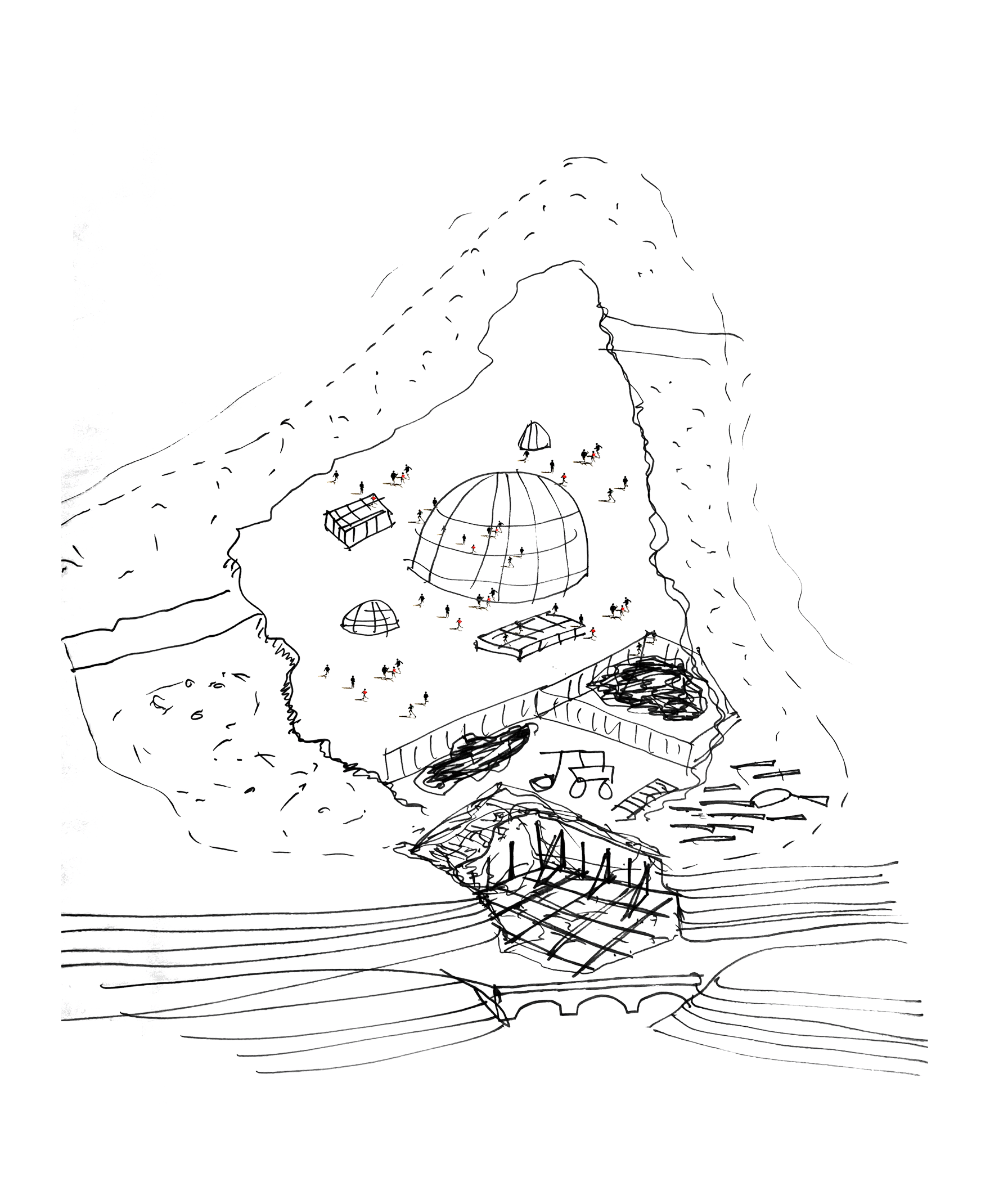Phase 2: Building & Regeneration The building facade is completed, providing protected, multi-functional space for exhibitions and artefact storage. The surrounding landscape regenerates, evolving alongside ongoing activity.